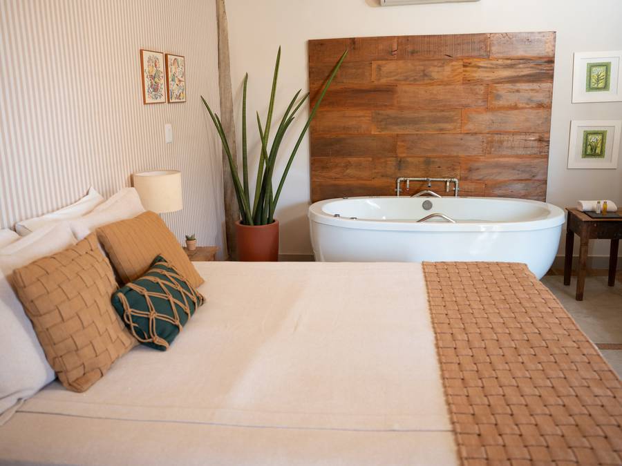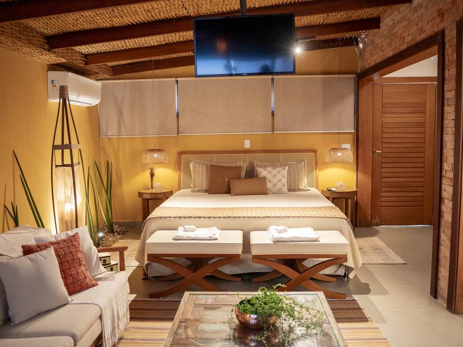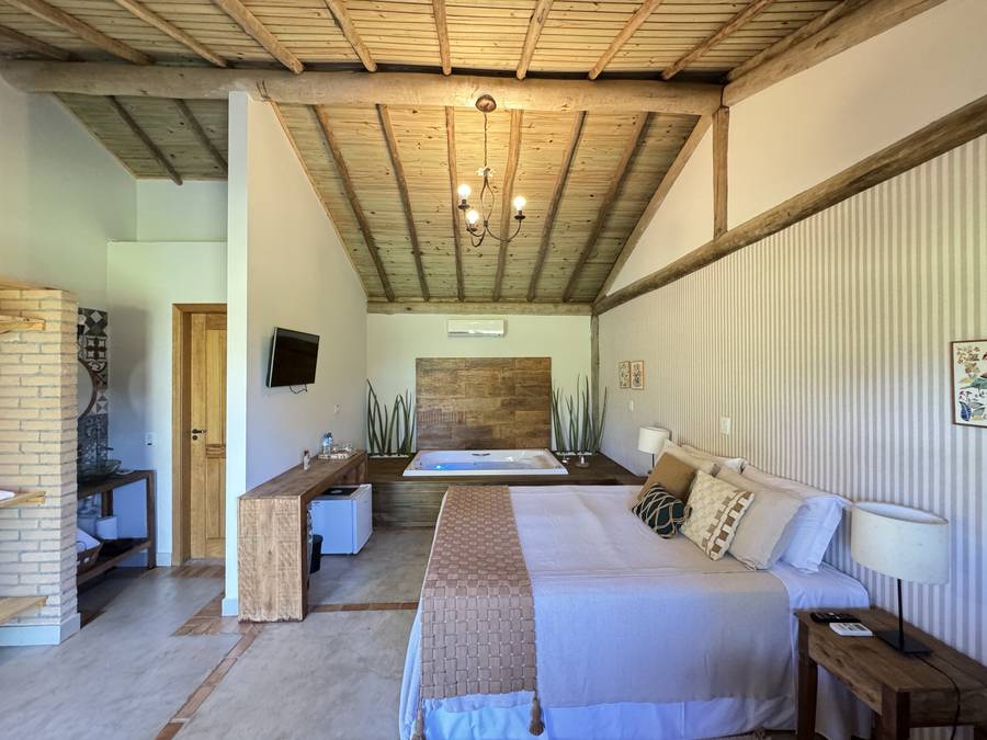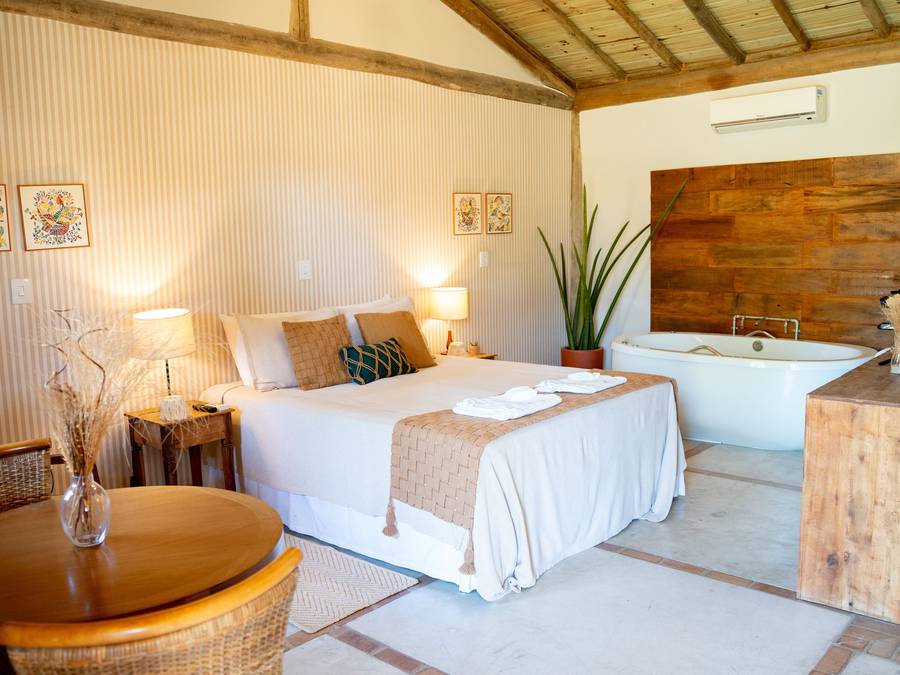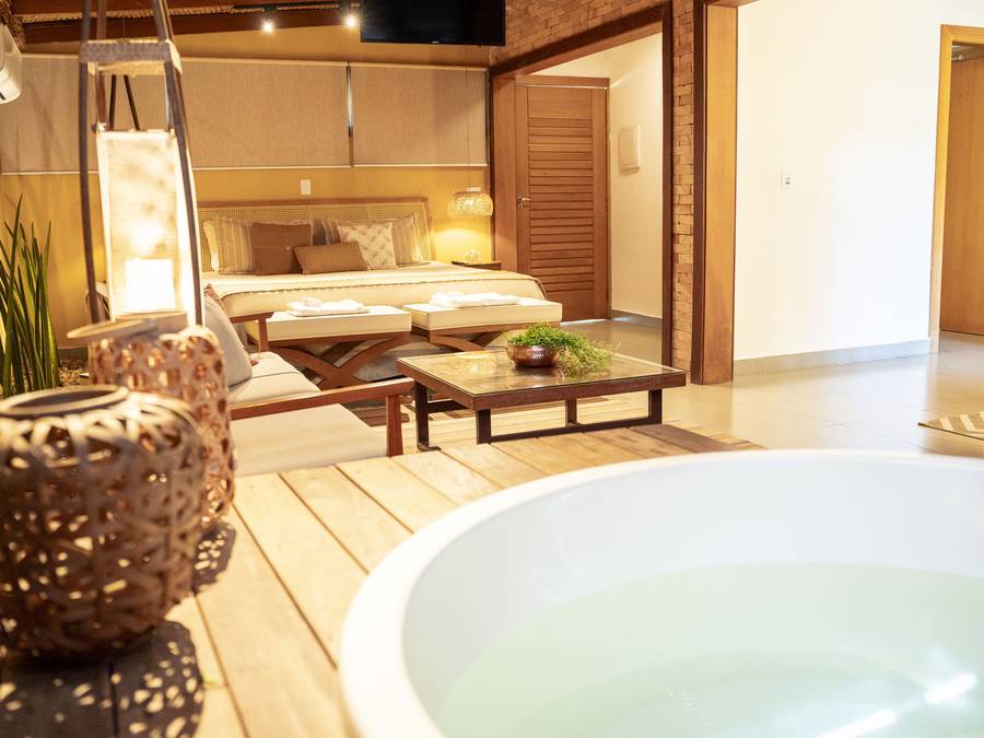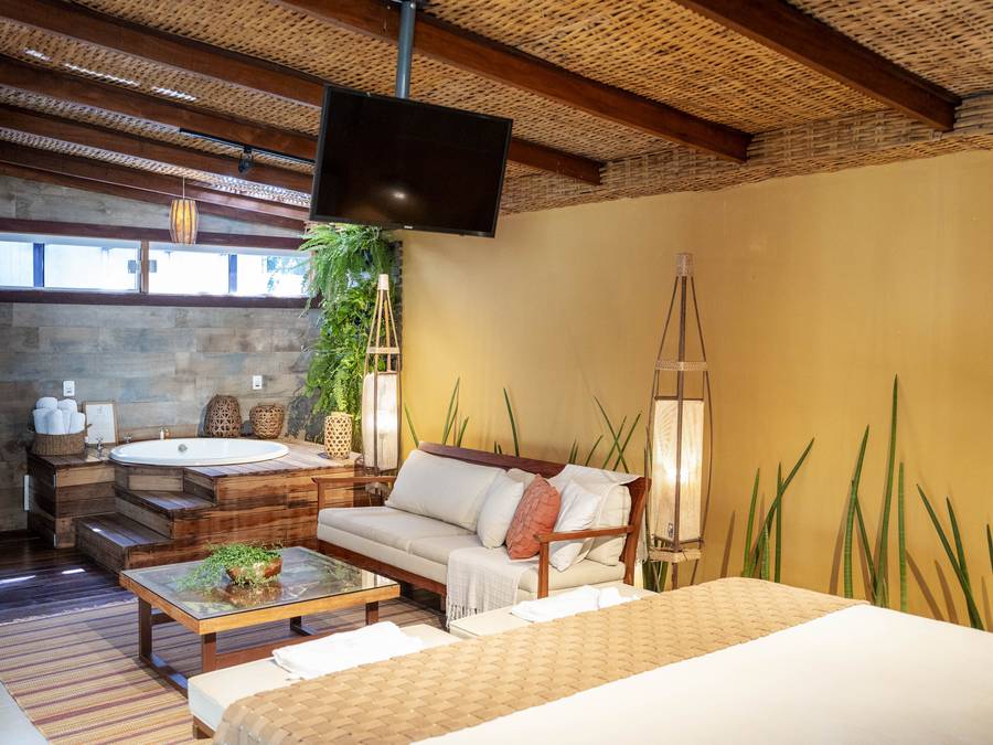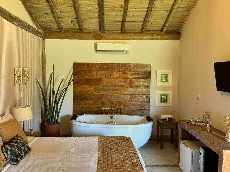 Wifi Smart TV com Netflix Frigobar Cofre Ar Condicionado Secador de Cabelo Cama Box King Size Amenities Sustentáveis Enxoval 300 Fios Aquecedor Elétrico Ducha OfurôCabana Dupla com Hidro Luxo
