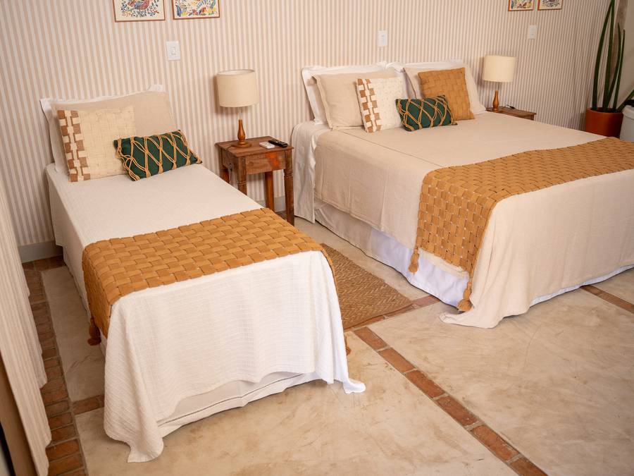 A Cabana Quádrupla pode ser configurada com uma cama de casal e duas de solteiro ou quatro camas de solteiro. Possue 30m2 e varanda com vista para o jardim. Amenities L’Occitane au Brésil, Enxoval 300 Fios e Toalhas Trousseau.
