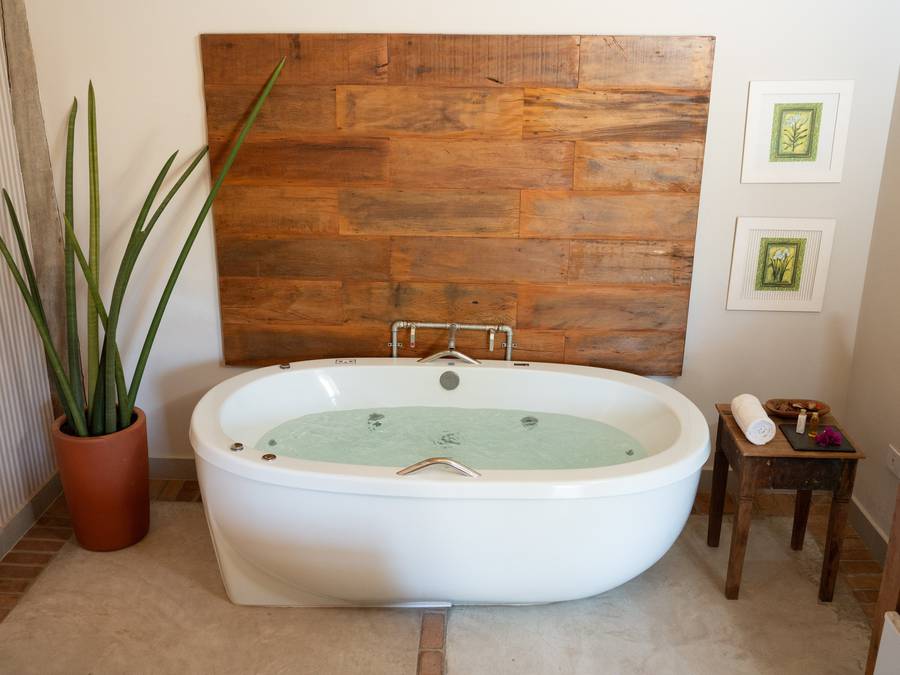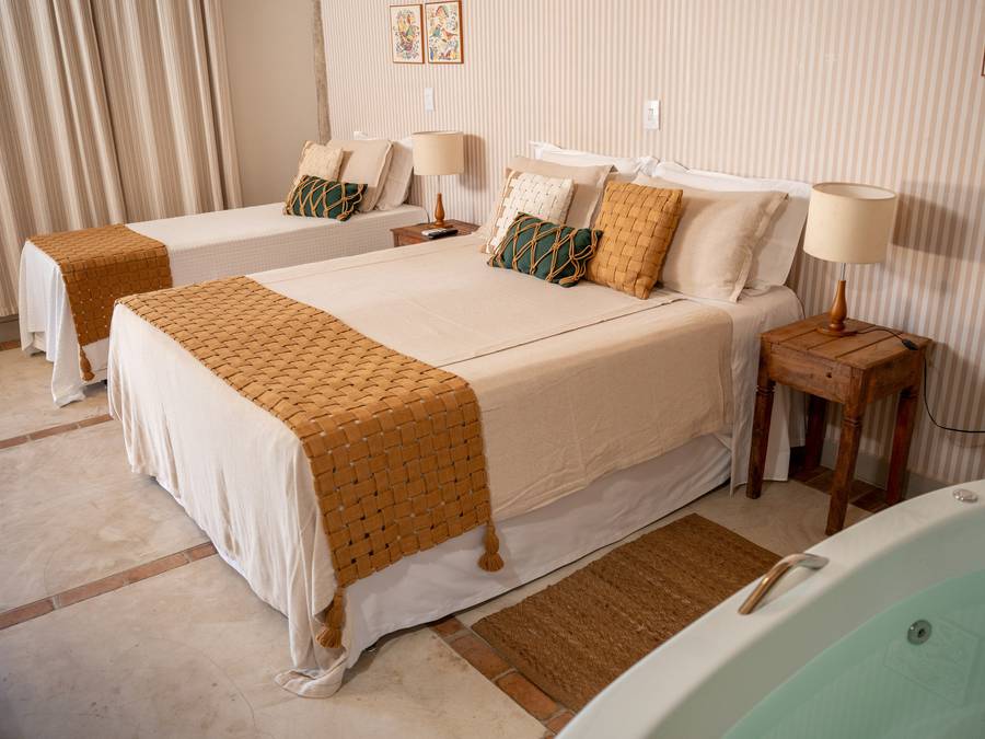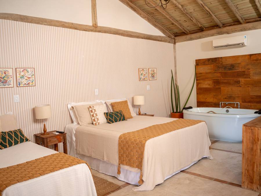 A Cabana Tripla com hidro pode ser configurada com uma cama de casal e uma de solteiro ou três camas de solteiro. Possue 30m2 e varanda com vista para o jardim. Enxoval 300 Fios e Toalhas Trousseau. Amenities L’Occitane au Brésil.