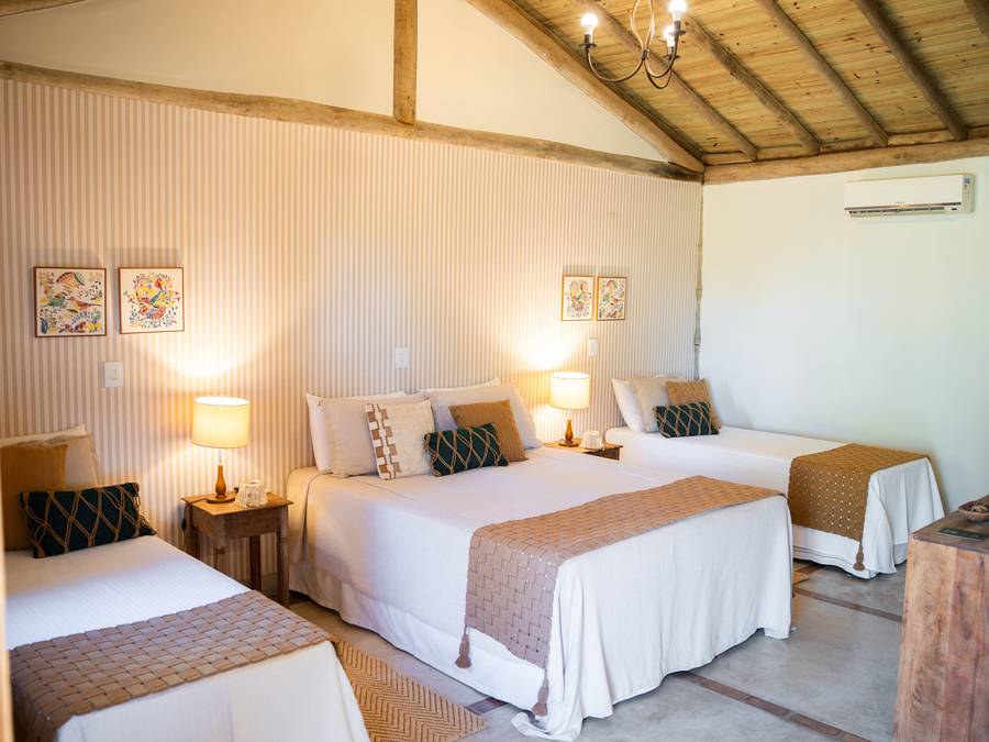 A Cabana Tripla pode ser configurada com uma cama de casal e uma de solteiro ou três camas de solteiro. Possue 30m2 e varanda com vista para o jardim. Amenities L’Occitane au Brésil, Enxoval 300 Fios e Toalhas Trousseau.