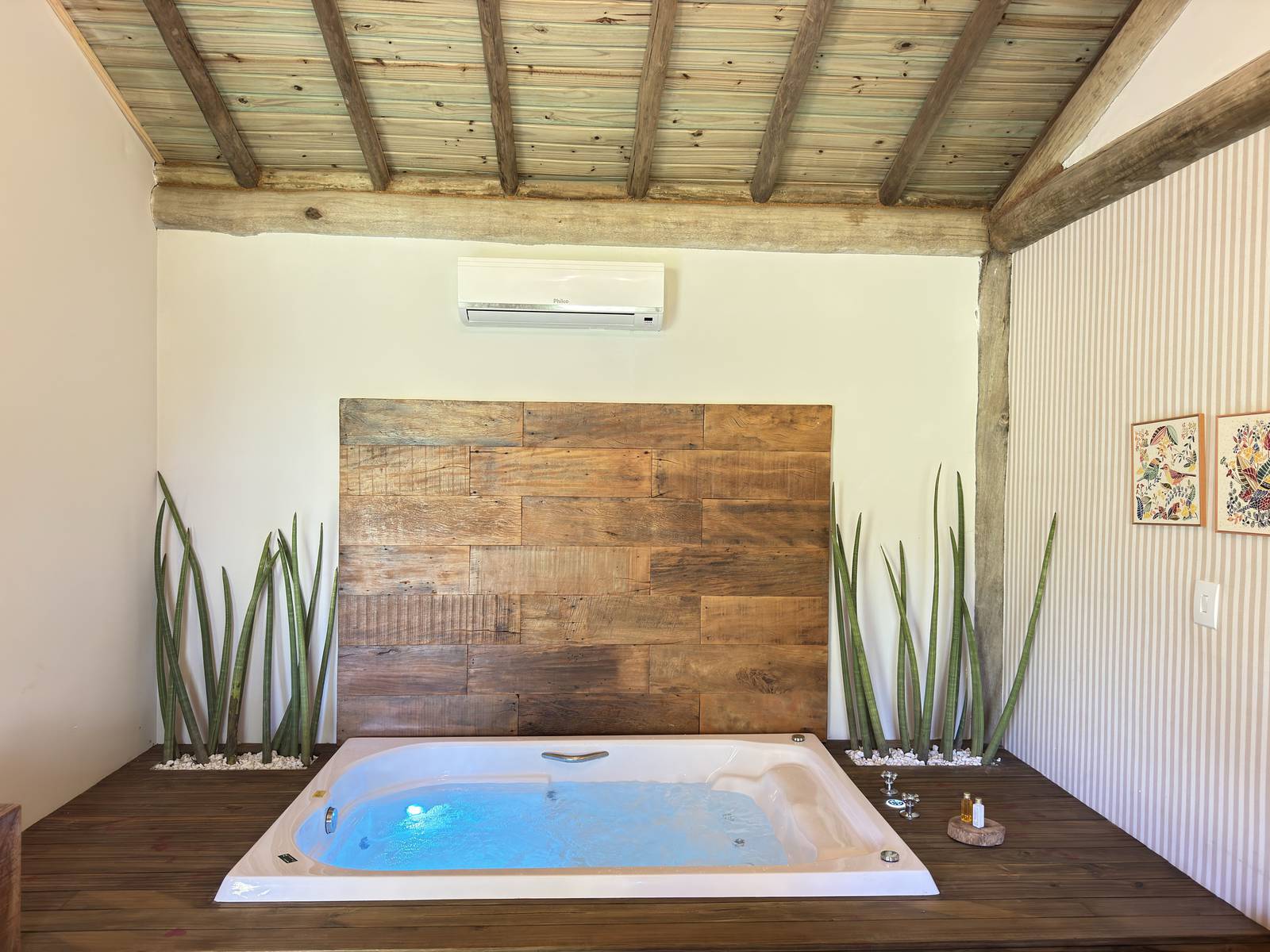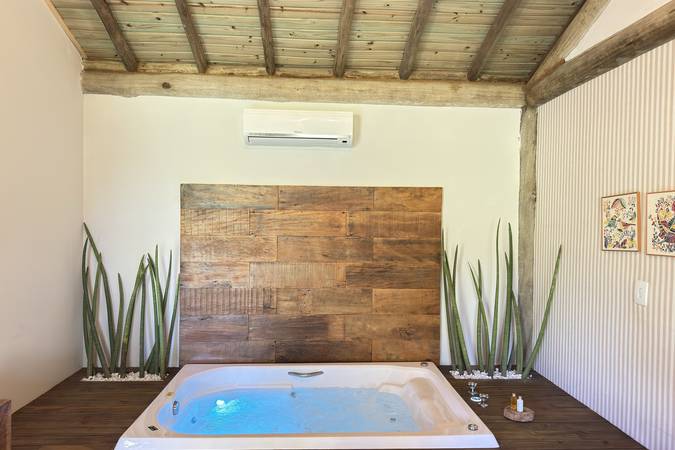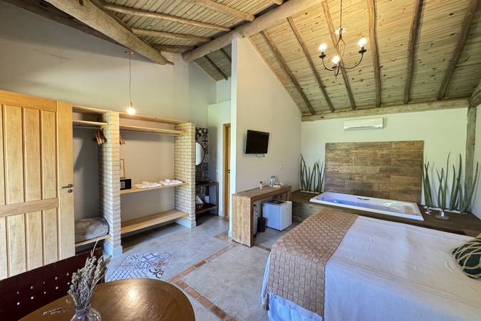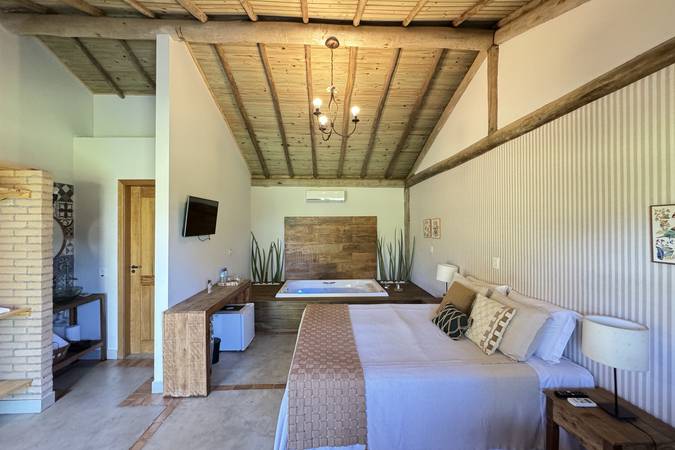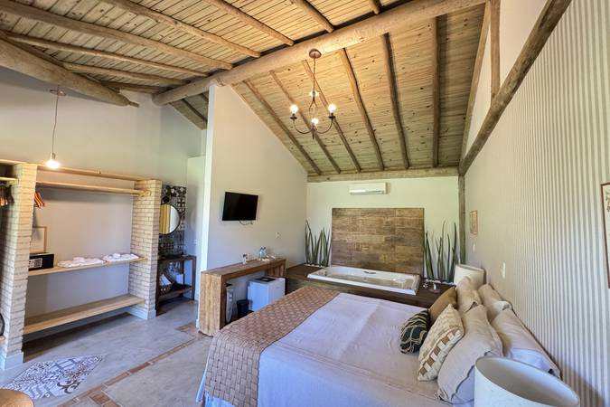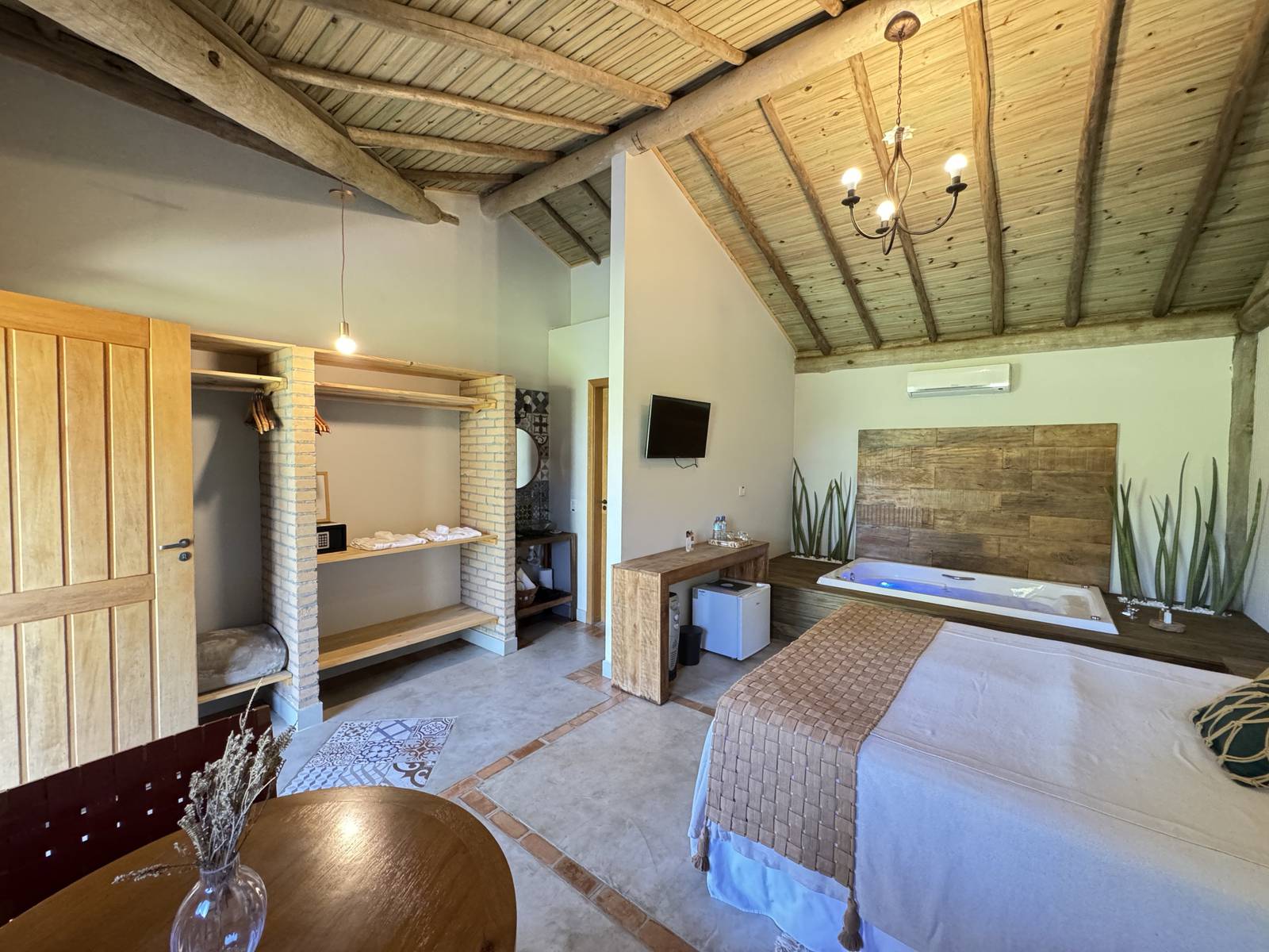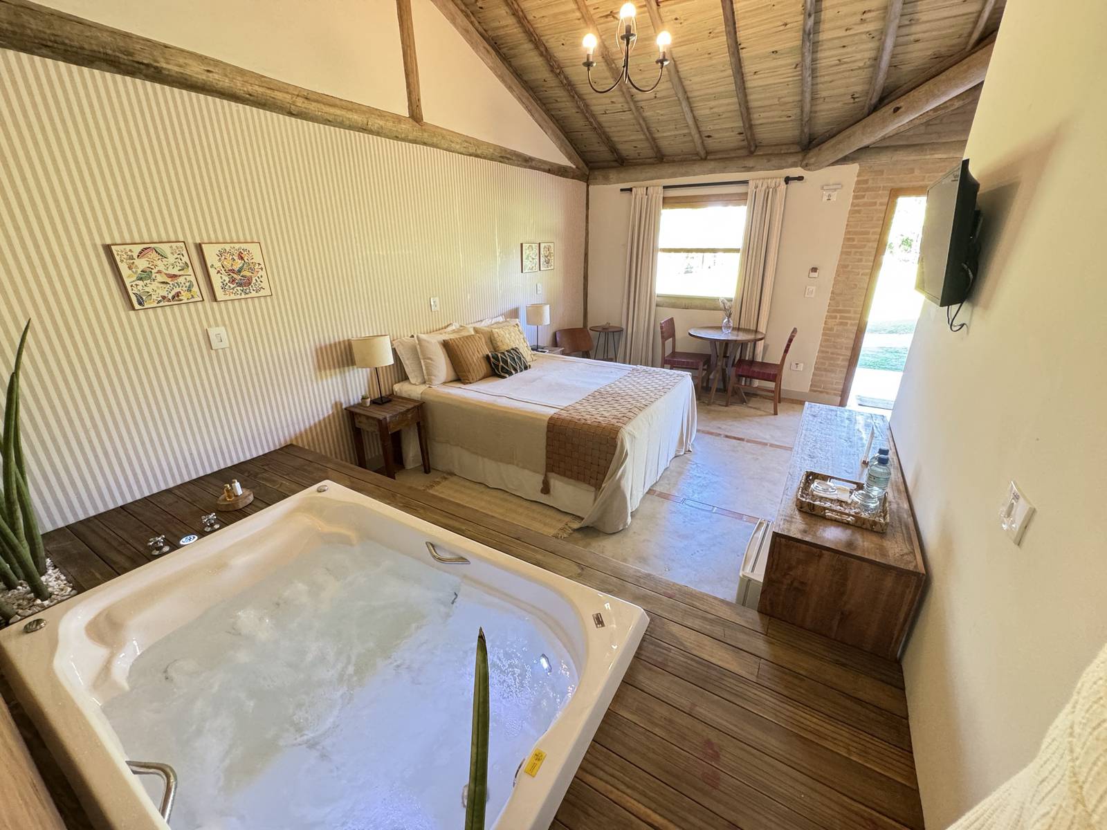 A Cabana Dupla com Hidro Luxo pode ser configurada com uma cama de casal ou duas camas de solteiro. Possui 30m2 e varanda com vista para o jardim, Enxoval 300 Fios e Toalhas Trousseau e Amenities L’Occitane au Brésil.