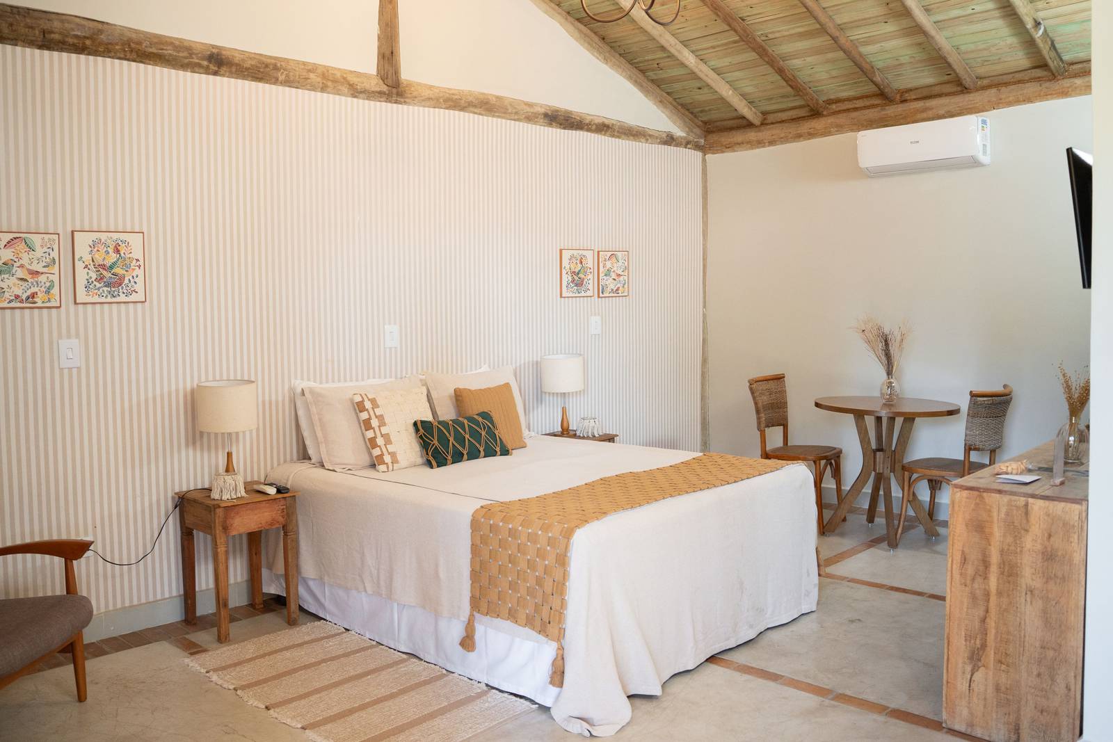 A Cabana Dupla pode ser configurada com uma cama de casal ou duas camas de solteiro. Possue 30m2 e varanda com vista para o jardim, além de Amenities L’Occitane au Brésil, Enxoval 300 Fios e Toalhas Trousseau.