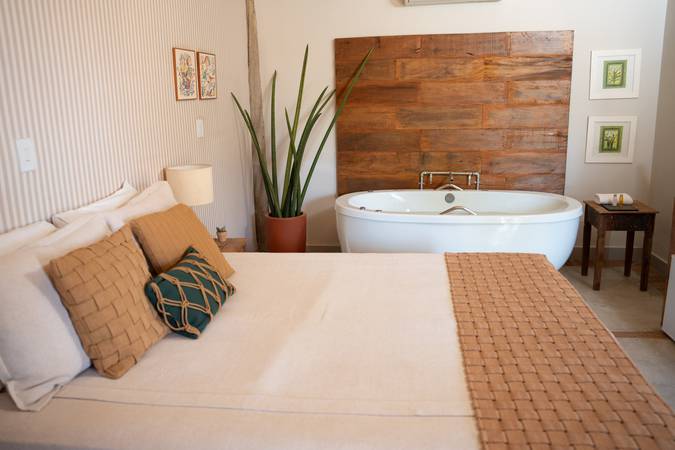 A Cabana Dupla com Hidro pode ser configurada com uma cama de casal ou duas camas de solteiro. Possui 30m2 e varanda com vista para o jardim. Amenities L’Occitane au Brésil, Enxoval 300 Fios e Toalhas Trousseau.