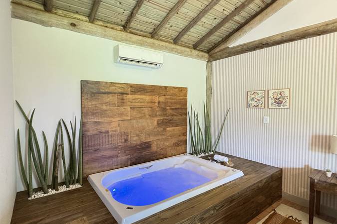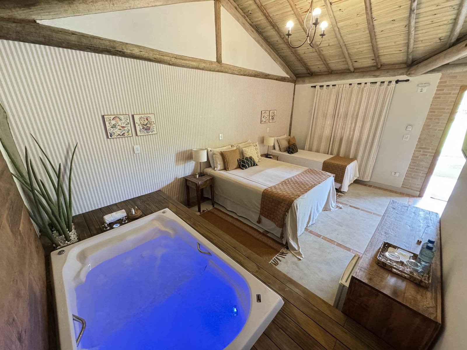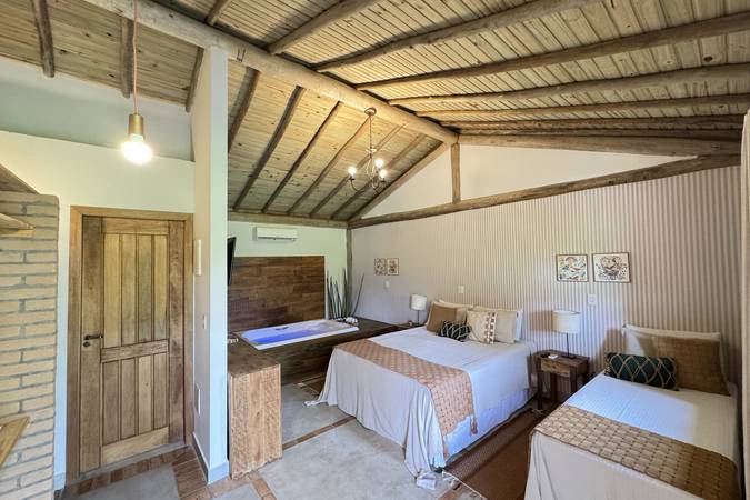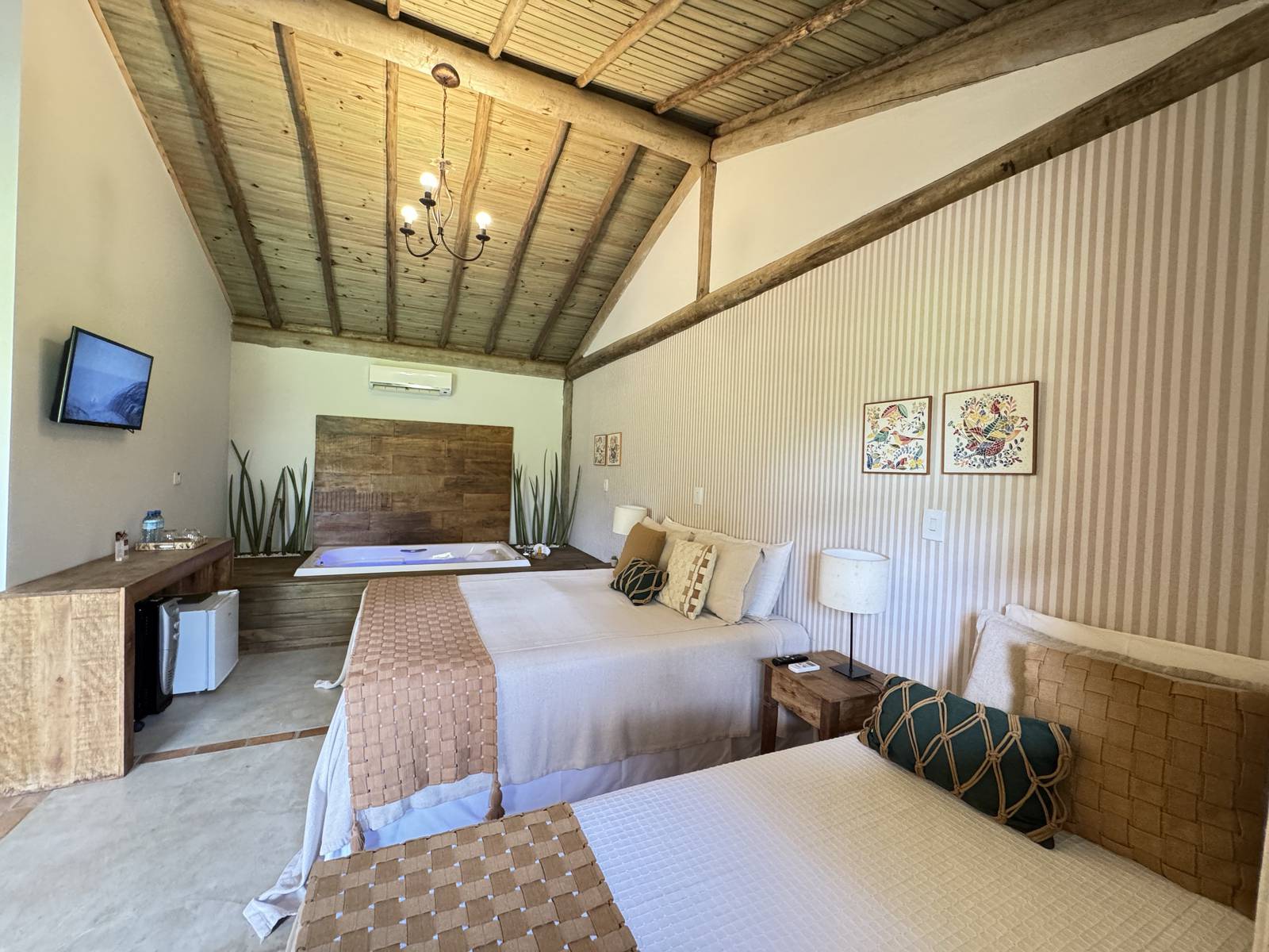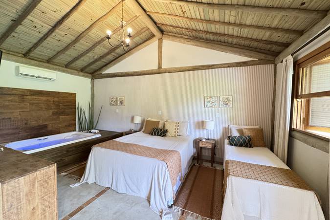 A Cabana Tripla com Hidro com jatos turbo pode ser configurada com uma cama de casal e uma de solteiro ou três camas de solteiro. Possue 30m2 e varanda com vista para o jardim. Amenities L’Occitane au Brésil, Enxoval 300 Fios e Toalhas Trousseau.