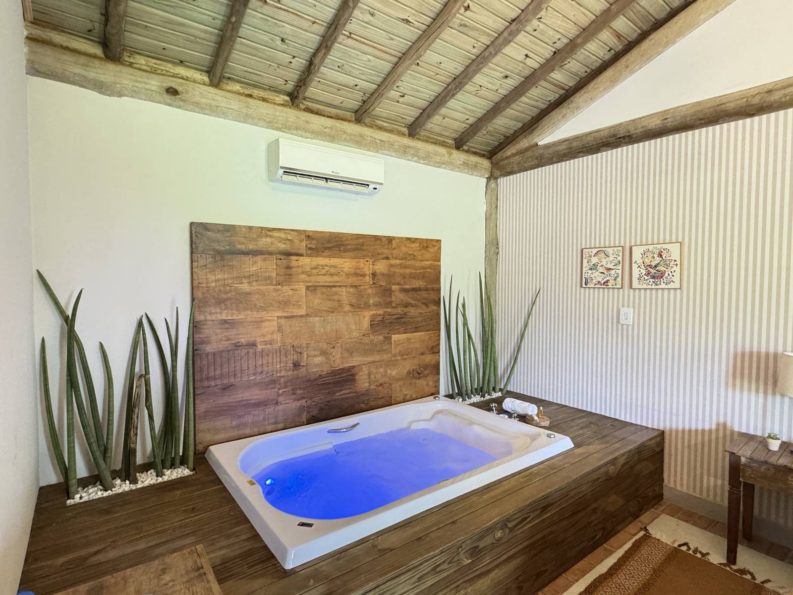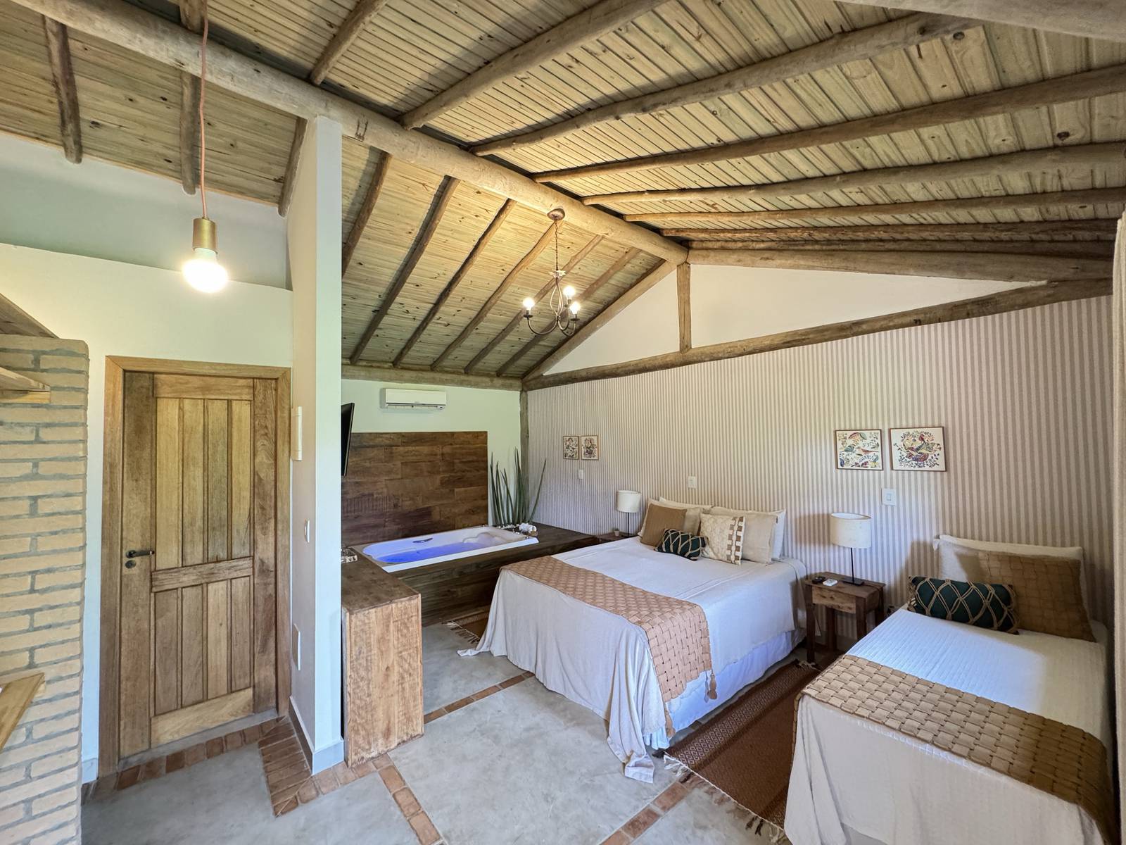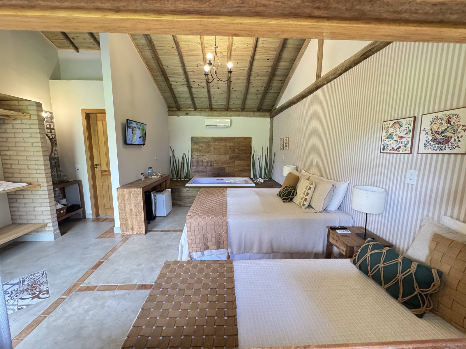 A Cabana Tripla com Hidro com jatos turbo pode ser configurada com uma cama de casal e uma de solteiro ou três camas de solteiro. Possue 30m2 e varanda com vista para o jardim. Amenities L’Occitane au Brésil, Enxoval 300 Fios e Toalhas Trousseau.